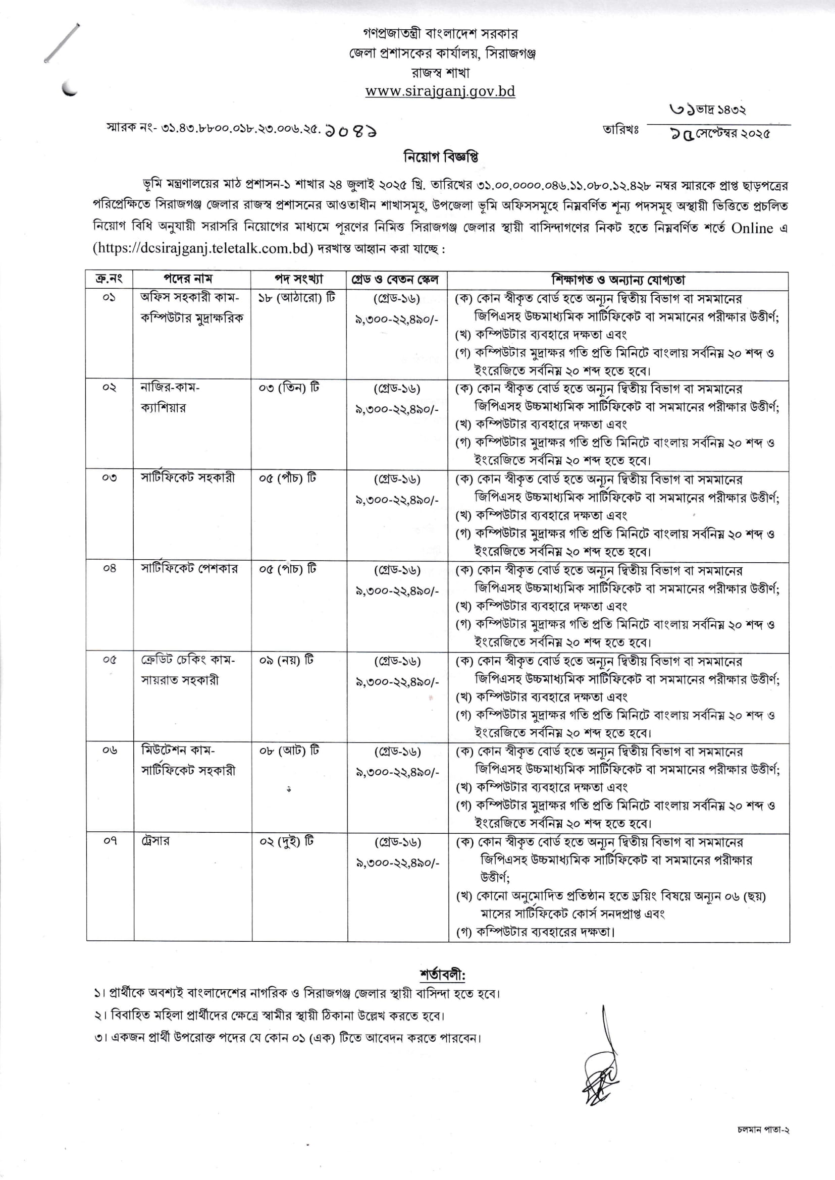 Sirajganj DC Office Job Circular 2025